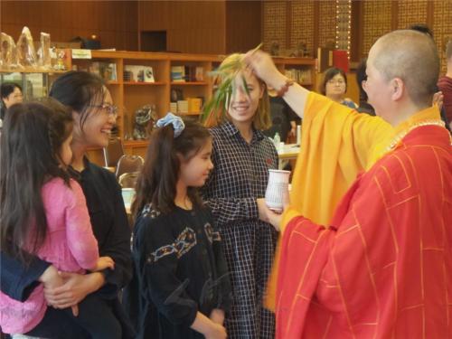 法師以楊枝甘露水為皈依者灑淨。