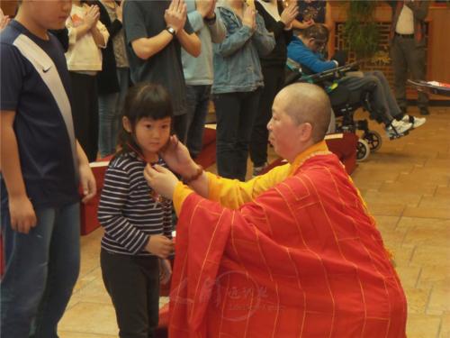 「我是佛」,妙祥法師請大家大聲說出,允諾本自具足的佛性自此日起歸隊,共同為人間佛教弘法而努力,未來無論是以觀音媽媽為依靠的寶寶、善童,或以星雲大師為師的成人,都能常回佛光山總本山及全球道場參訪,讓信仰更堅定。現場歡樂洋溢,佛門新成員圓滿人生重要的一刻。