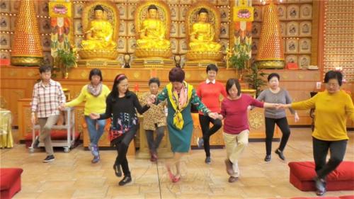 午齋後,為了證明自己老當益壯、老而彌堅,隨著「苗條舞蹈工作室」丁錦秀老師的節拍,多位老菩薩一起學習新舞步;才練習10分鐘,竟然就跟著音樂大顯身手,準確無誤地完成一支健身舞蹈。