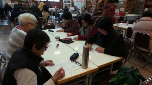 承辦會考的柏林協會第二分會會長唐雪峰,為大家考前衝刺再做複習;應考答題時,各個都胸有成竹,只見菩薩或振筆疾書,或低頭苦思;「勇氣」不足的信眾在一旁,默默地為考生們加油祝福。