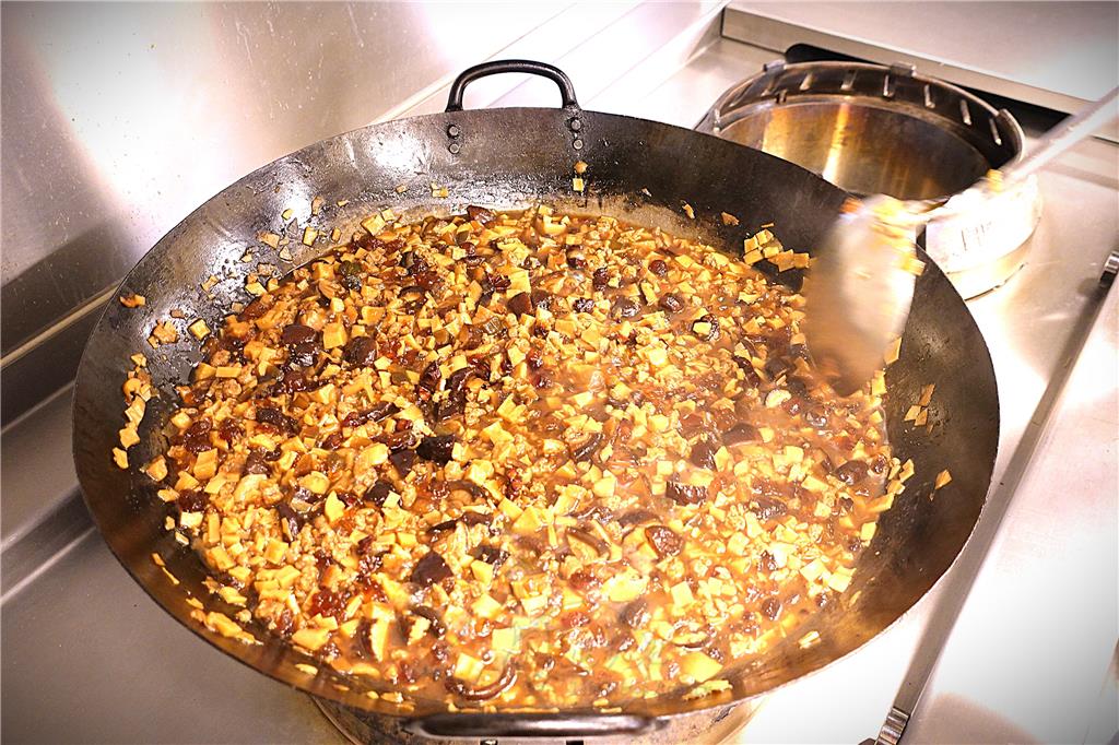 一切準備就緒就要起鍋。材料的份量與下鍋的次序也有講究,這也是為何相同的食材與調味料,煮出來的味道與口感不同的原因。雅筑毫不藏私的跟大家分享烹飪的竅門。大家在笑談間也輪流幫忙翻動鍋中熬煮的素肉燥,避免黏鍋燒焦,在攪拌過程中也可調整口味,並讓湯汁煮沸,讓食材入味。當看到呈現油亮、噴香、濃郁狀態時就是大功告成。
