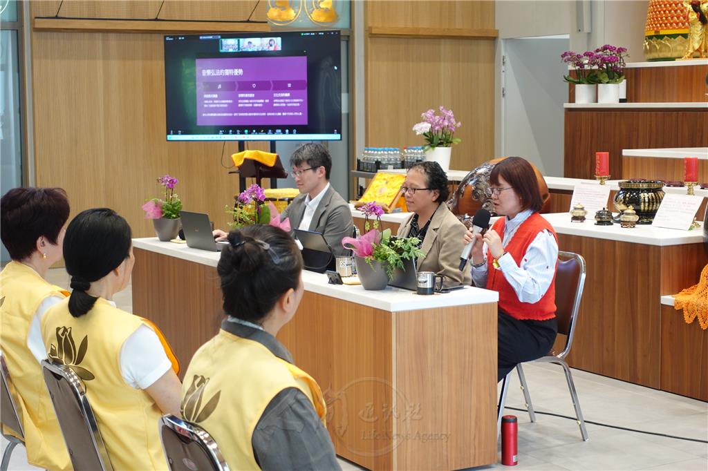 鄭維儀則以「歐洲弘法史採風心得」為題,從佛教本土化與人間佛教理念切入,分享她在巴黎法華禪寺、倫敦佛光山及柏林佛光山的觀察。她介紹歐洲道場在本土化上的努力與成果,包括多語翻譯人才培訓、歐洲佛光聯誼會論壇、佛光中文學校,以及菩提園青少年佛門體驗營等。