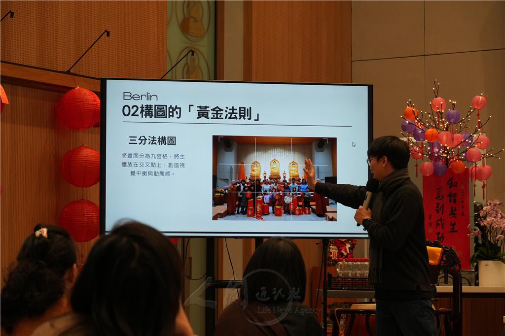 他們以到達柏林佛光山後的第一次早課所攝相片為例,幫助大家理解廣角鏡頭運用特點。同一場景,廣角鏡頭的畫面主體非常有力量感,相應攝影者需採用低體位仰角拍攝;標註鏡頭只需攝影者常規站立、平角拍攝,但畫面缺乏震撼力。在構圖方面,他們讚許柏林佛光山充滿線條美,方中有圓、圓中有方,期待大家利用這些線條,將佛堂的美更多地展現出來。
